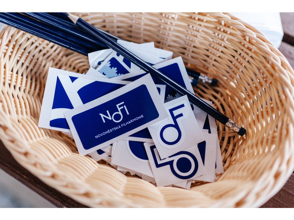 Klasická dřevěná tužka s gumou, zdobená logem Novoměstské filharmonie.